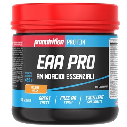 Gli aminoacidi sono molecole organiche composte sia da un gruppo amminico (NH2) che da un gruppo carbossilico (COOH), che, unite fra loro, tramite un legame peptidico vanno a formare la struttura primaria delle proteine. Gli aminoacidi sono più di cento ma solamente venti sono definiti proteinogenici perché concorrono alla formazione delle proteine e quindi sono fondamentali al funzionamento del nostro organismo. Di questi solamente 9 vengono definiti essenziali. Con il termine aminoacidi essenziali (dall'inglese Essential Amino Acid – EAA) sono indicati quegli aminoacidi che l'organismo non è in grado di sintetizzare da solo. Quindi devono essere obbligatoriamente introdotti con l'alimentazione. Gli EAA intervengono in innumerevoli processi metabolici cerebrali, fisici immunitari Si trovano in molti alimenti, specialmente in quelli ad elevato valore proteico ma le persone che praticano una intensa attività fisica potrebbero avere un gap proteico da colmare con l'assunzione possibilmente mattutina di EAA anche in alternativa alle proteine Colmare tale gap consente di migliorare la qualità dell'allenamento, stimolando una corretta sintesi proteica ed evitando il fenomeno del catabolismo proteico Pronutrition ha formulato una miscela di EAA di origine vegetale senza coloranti e senza aspartame, perfettamente bilanciata, perfettamente solubile in acqua e di ottima palabiltà da assumere possibilmente al mattino e comunque a stomaco vuoto per ottimizzare l'assorbimento che si svolge in due fasi: la rottura del legame peptidico nello stomaco e nel duodeno ed il successivo assorbimento nell'intestino tenue. L'elenco e le quantità degli EAA le trovi nella tabella nutrizionale esposte sia per dose consigliata (28g) che per 100g.