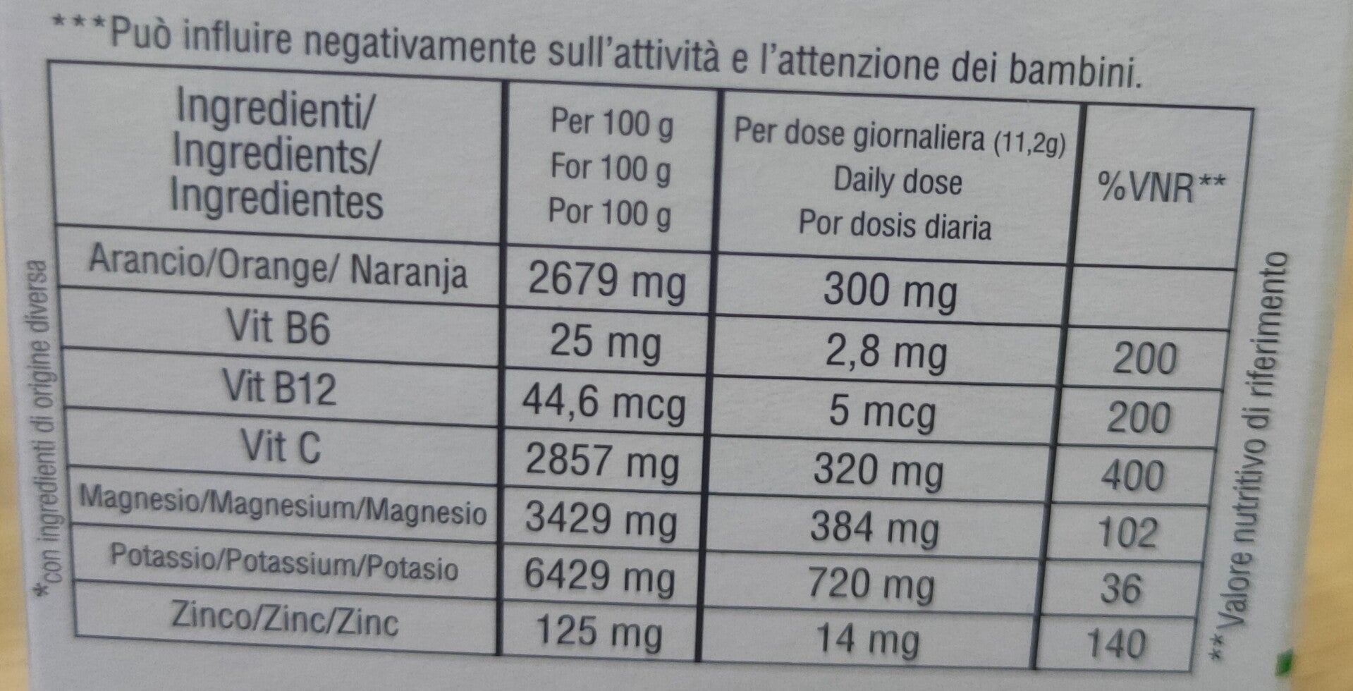INGREDIENTI:Edulcoranti: Eritritolo e Suctalosio, Magnesio Citrato, Potassio Citrato, Regolatore di acidità: Sodio Bicarbonato, Arancio (Citrus sinensis – Frutti, succo polvere), Acidificante: Acido Citrico anidro, Aroma: Arancia, Vitamina C (Acido L- Ascorbico), Zinco Gluconato, Antiagglomerante: Silice micronizzata, Colorante: Rosso Ponceau**, Vitamina B6 (Piridossina Cloridrato), Vitamina B12 (Cianocobalamina).