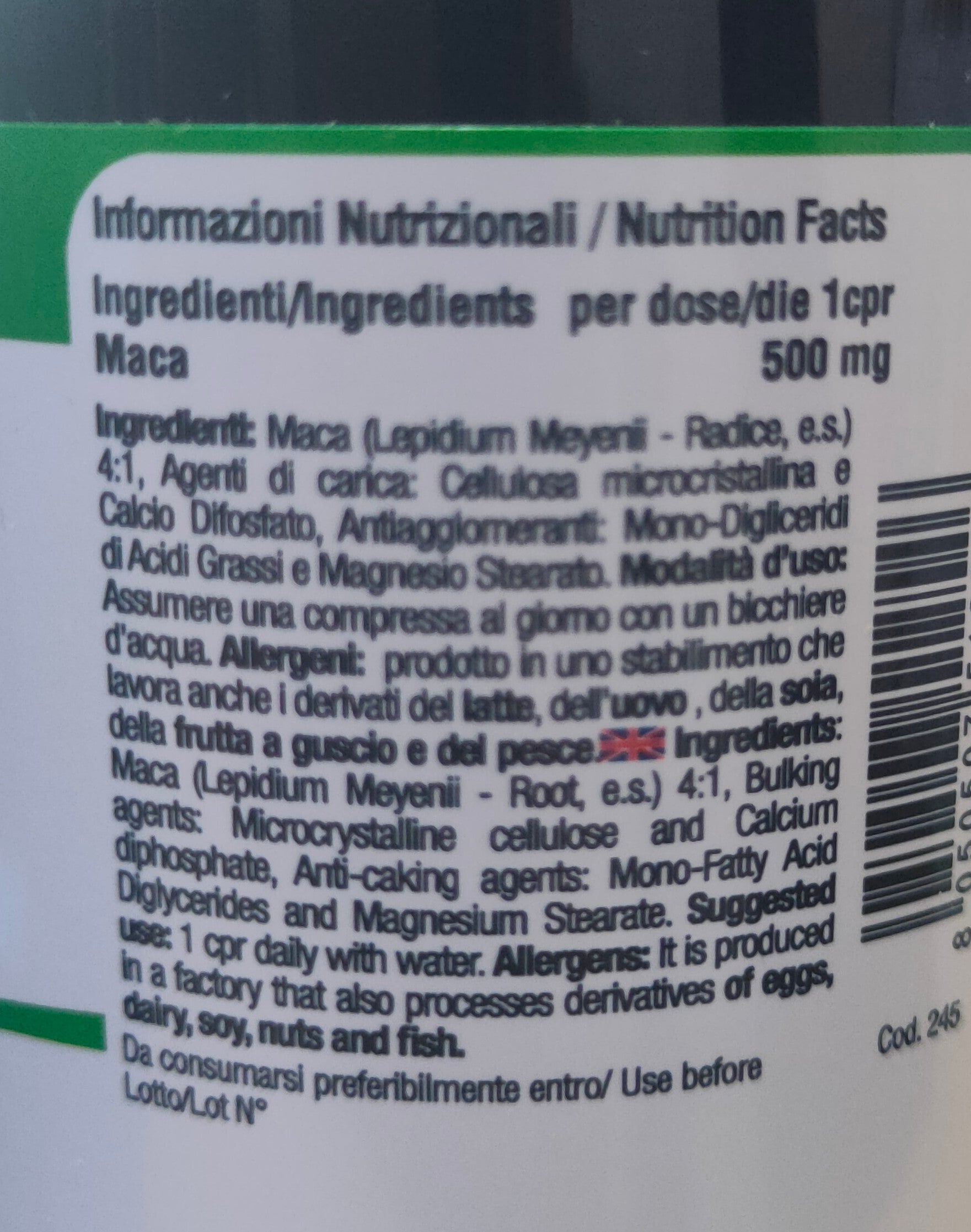 INGREDIENTI:Maca (Lepidium Meyenii - Radice, e.s.), Agenti di carica: Cellulosa microcristallina e Calcio Difosfato, Antiagglomeranti: Mono-Digliceridi di Acidi Grassi e Magnesio Stearato.