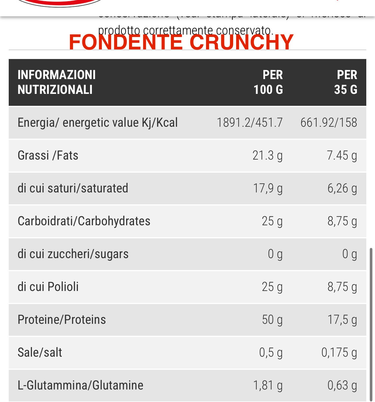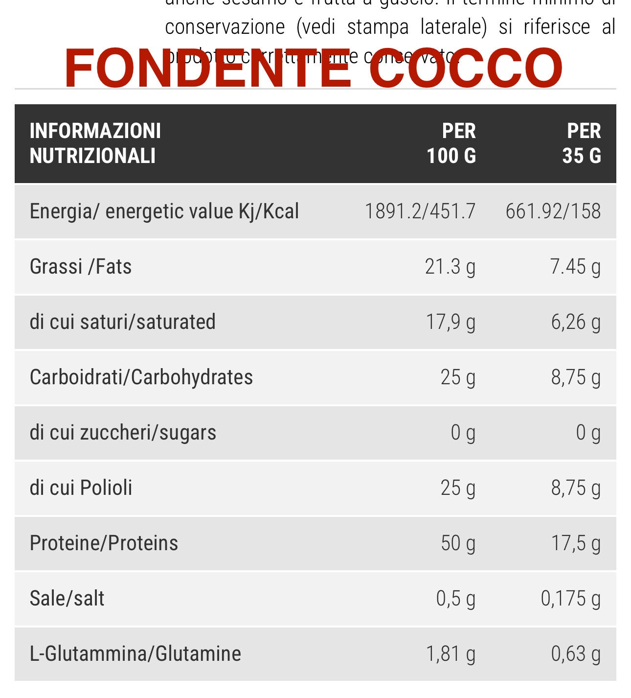 Copertura bianca [maltitolo, grassi vegetali non idrogenati (olio di cocco, burro di cacao), latte magro istantaneo, EMULSIONANTE: lecitina di girasole, sale, aromi naturali.]proteine idrolizzate del siero del latte (Carbery Optipep® 90 ist.DH4), estruso proteico del latte, L-Glutammina Kyowa Quality®, sucralosio.