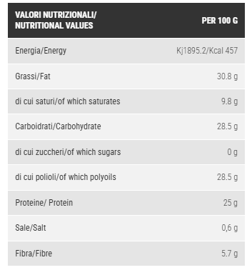 Ingredienti:CREMA BISCOTTO NOCCIOLA: [Maltitolo, mix proteico (proteine del siero del latte isolate, soia isolato proteico),grassi vegetali (burro di karitè, olio di girasole, burro di cacao), cacao 10/12, nocciole, lecitina di girasole, aroma], BISCOTTO AL CACAO [semola rimacinata varietà 100% senatore Cappelli, edulcorante: maltitolo, olio extravergine di oliva, uova fresche, amido di frumento modificato, bicarbonato di ammonio, pirofosfato di sodio, cacao 5%.