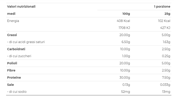 INGREDIENTI: proteine di riso, proteine del GRANO, proteine del LATTE, BURRO, albume d'UOVO, maltitolo, eritritolo, fibra di FRUMENTO, fibra di acacia, emulsionante: lecitina di girasole, agenti lievitanti: bicarbonato di sodio, pirofosfato di sodio, *.