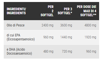 integratore alimentare a base di olio di pesce (sardina) in forma etilestere ottenuto per distillazione molecolare ricco in EPA e DHA. Il prodotto è certificato friend of the sea, l’unico programma di certificazione per la pesca sostenibile riconosciuto e supervisionato a livello internazionale.Viene prodotto da KINOMEGA, che possiede un sistema di purificazione brevettato per rimuovere metalli pesanti, pesticidi,diossina, PCBs ed evitare l’ossidazione del prodotto durante la purificazione. Kinomega detiene inoltre un brevetto che garantisce di ottenere un prodotto senza ritorno di gusto ed odore L’EPA e il DHA contribuiscono alla normale funzione cardiaca. Il DHA contribuisce al mantenimento della normale funzione cerebrale e al mantenimento della capacità visiva normale. La Vitamina E contribuisce alla protezione delle cellule dallo stress ossidativo. L’effetto benefico su funzione cerebrale e capacità visiva si ottiene con l’assunzione giornaliera di 250 mg di DHA. L’effetto benefico sulla funzione cardiaca si ottiene con l’assunzione giornaliera di 250 mg di EPA e di DHA.